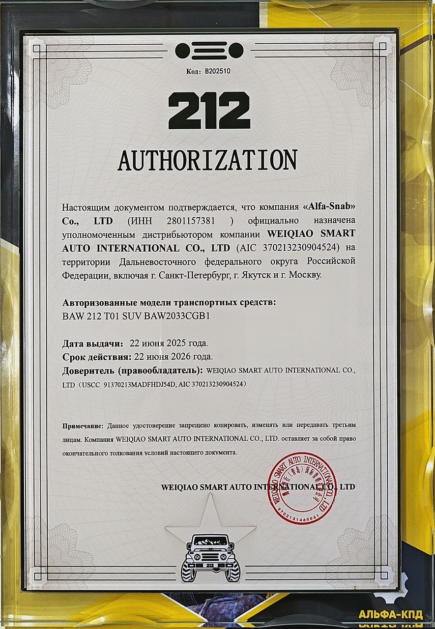 Компания WEIQIAO SMART AUTO INTERNATIONAL CO., LTD направила нам официальный документ, подтверждающий наш статус уполномоченного дистрибьютора внедорожников BAW 212 на территории России, включая Дальневосточный федеральный округ, Санкт-Петербург, Якутск и Москву.